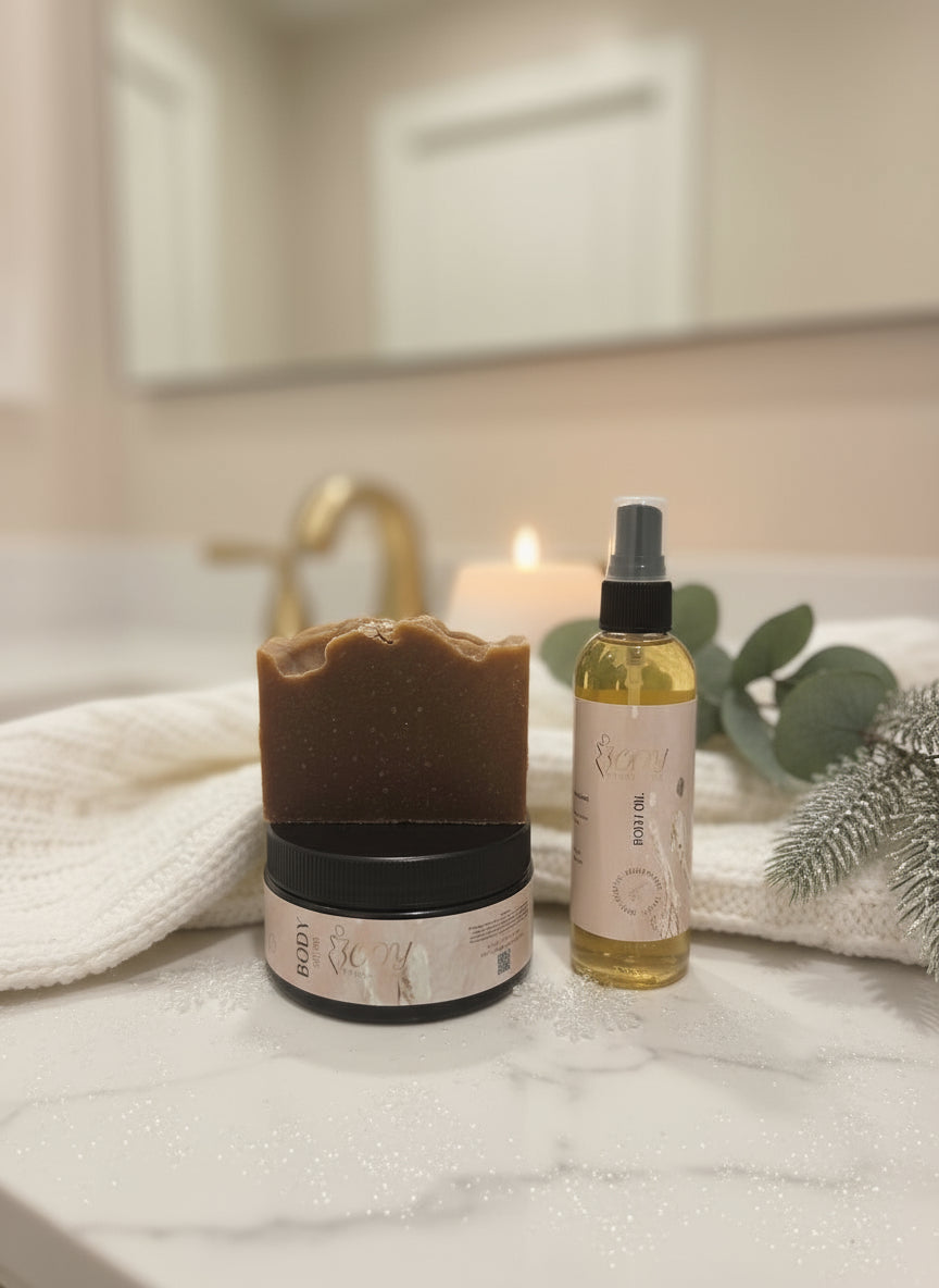When the cold hits, your skin shouldn't suffer. The Winter Rescue Ritual revives dry, dull skin with our deeply hydrating body butter, gentle exfoliating soap, and lightweight body oil. Together, they lock in moisture and restore your glow - so you can feel soft, smooth, and confident all season long.
